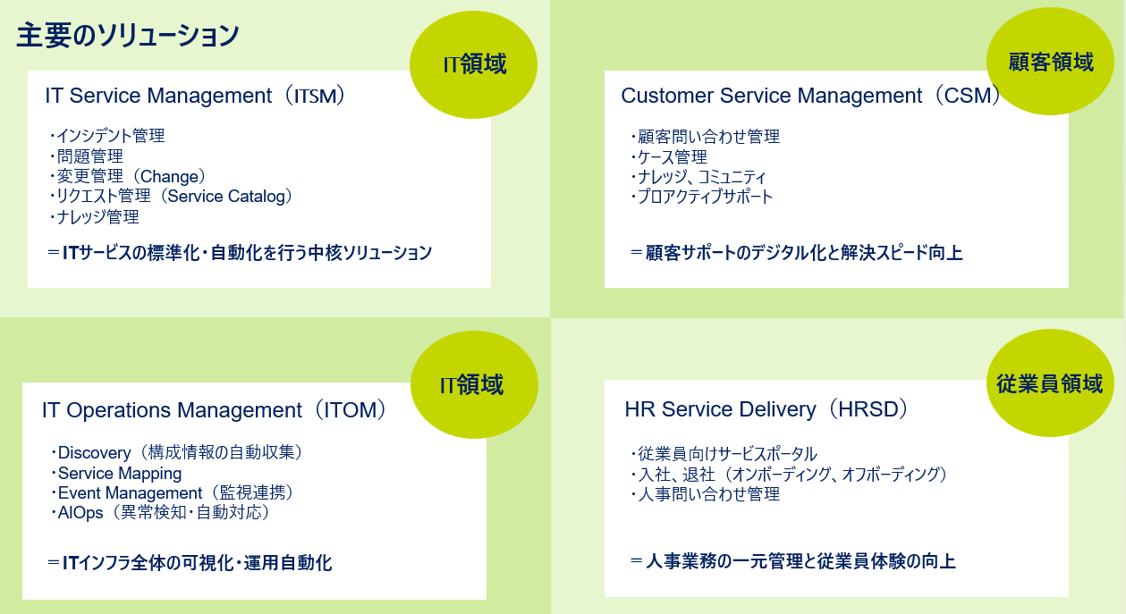 主なソリューションとしては、IT領域であるITSMやITOM、顧客領域であるCSM、従業員領域であるHRSDなどが挙げられます。